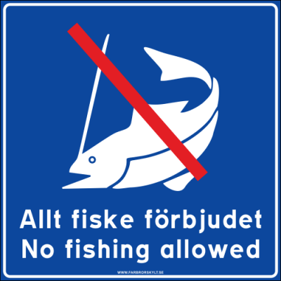 Skylt ”Allt Fiske Förbjudet, No Fishing Allowed” Blå 45x45cm 2 är en rejäl skylt i 1,4 mm hållbar och slitstark aluminium. Skylten trycks på printfolie med blå bakgrund och en vit fisk som är överstruken av ett rött streck. Texten upplyser ”Allt fiske förbjudet” och är svår att missförstå. Den får ett skyddande lager laminat så att den håller i väder och vind i många år.