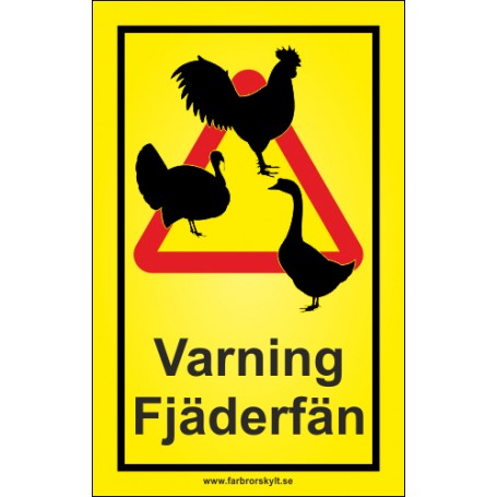 Skylt “Varning fjärderfän!” är en tydlig och väl synlig varningsskylt för dig med fjärderfän och bondgård där det passar att placera en skylt med en svart fjärderfän-siluett och texten Varning fjärderfän! tryckt på 1,4 mm hållbart och slitstarkt aluminium. Den får ett skyddande lager laminat så att den håller i väder och vind i många år.